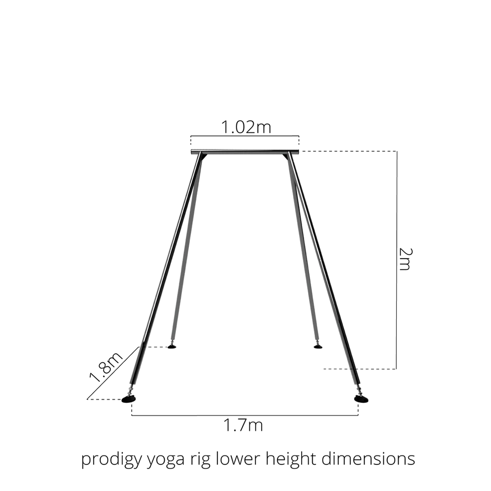 Prodigy heeft dit A-frame speciaal ontworpen voor Aerial Yoga, zonder concessies te doen aan veiligheid of stevigheid. Elke poot is gemaakt van een stalen buis met een diameter van 45 mm en een wanddikte van 1,8 mm, verbonden met geschroefde koppelstukken voor extra kracht en stabiliteit.